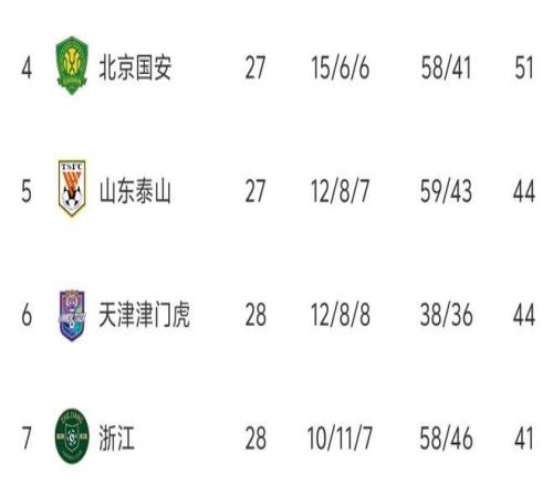 与此同时,第5的争夺同样激烈,天津津门虎在先赛一场的情况下追平山东泰山,两队同积44分分列第5和第6;浙江队则积41分排在第7。从积分上来看津门虎和浙江队都有冲击第5的机会,但倒数第2轮泰山队和津门虎直接对决,大概率将最终决定第5的归属。